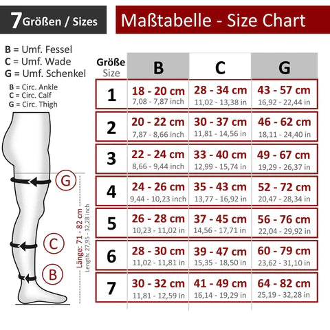 Um die für Ihre Gesundheit optimale Größe bei den Kompressionsstrümpfen zu finden, müssen Sie Ihre Beine wie folgt vermessen: