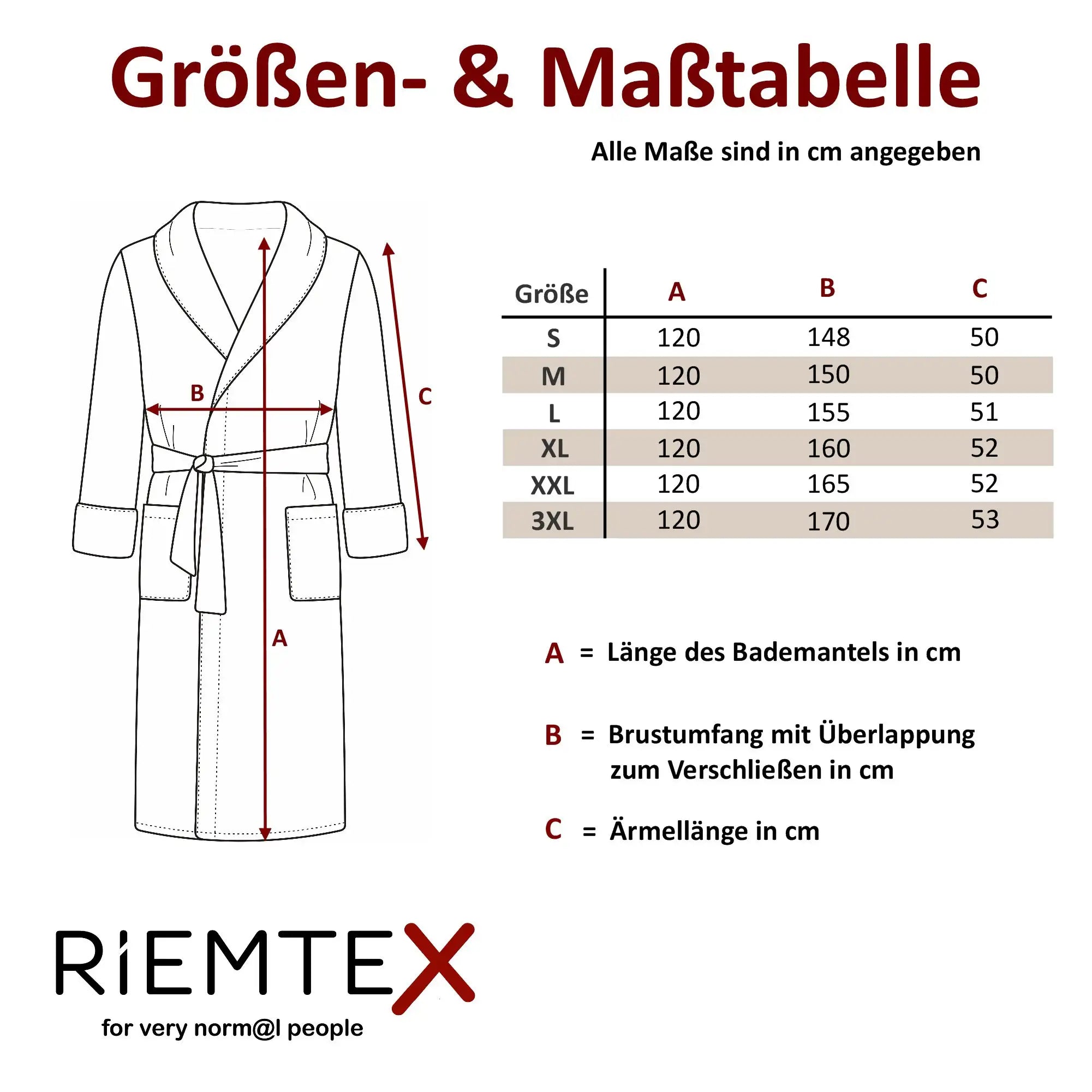 Bitte beachten Sie, dass unsere RIEMTEX Bademäntel nach deutschem bzw. österreichischem Standard geschnitten sind und entsprechend großzügig ausfallen.