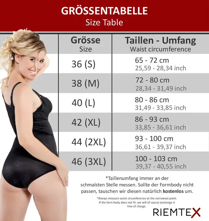 Zur Größenbestimmung messen Sie bitte einfach den Umfang Ihrer Taille an der schmalsten Stelle. Sollte der Formbody trotzdem nicht passen, tauschen wir diesen natürlich kostenfrei um.